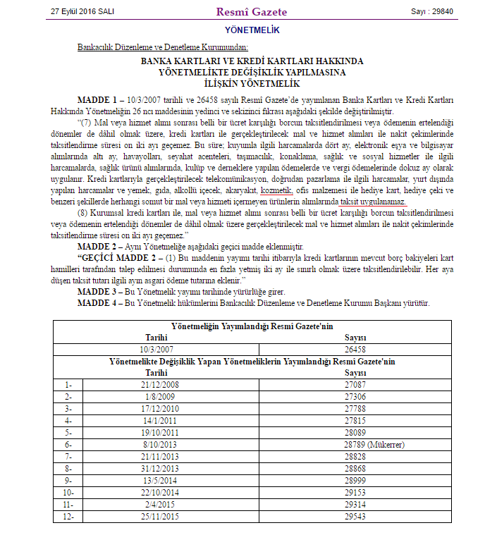 27 Eylül 2016 tarihli Resmi Gazetede yayınlanan yönetmelik aşağıda gibidir.