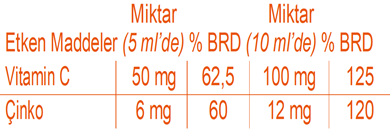 Deiyonize su, Sorbitoller, Șeker, L-askorbik asit (Vitamin C), Çinko sülfat monohidrat, Aroma verici: Portakal esansı, Koruyucu: Potasyum sorbat, Asitlik düzenleyici: Sodyum hidroksit.